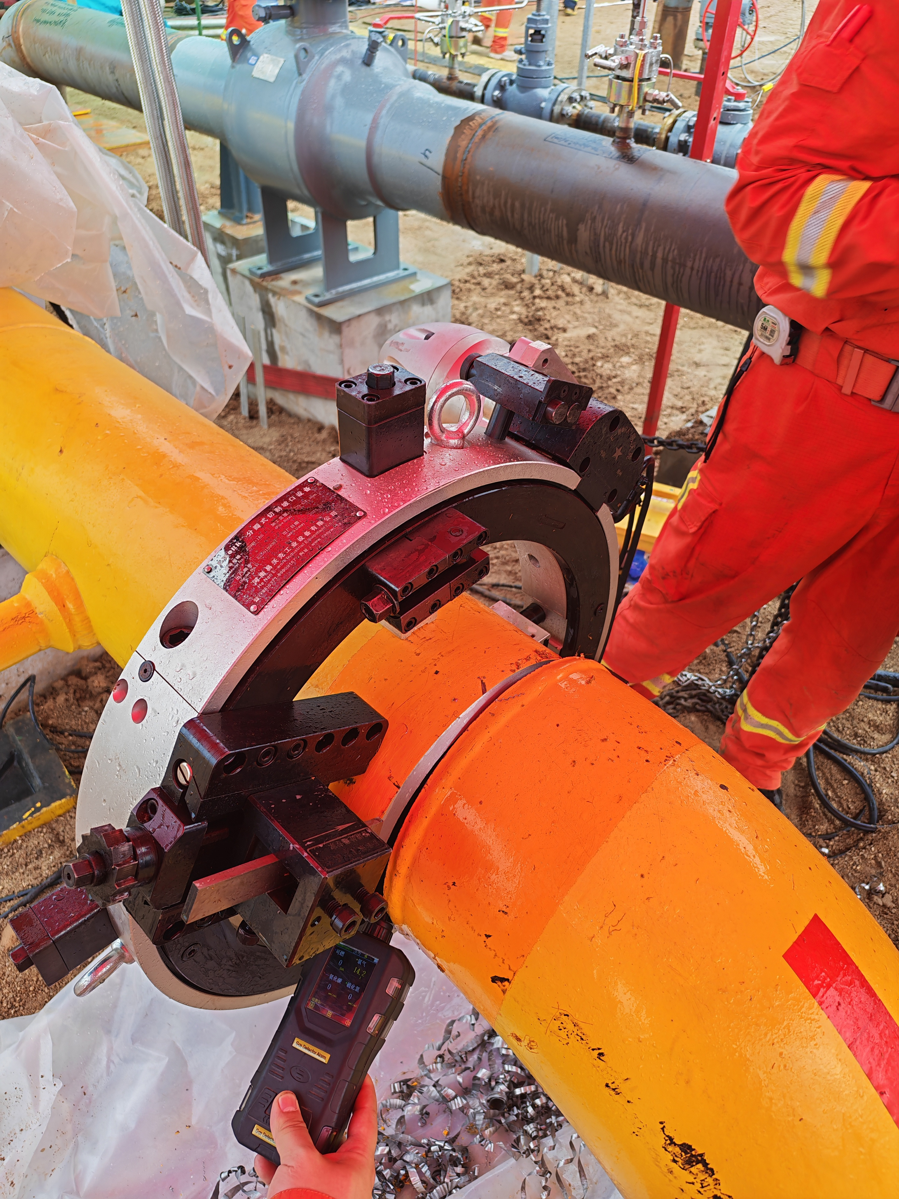 本次我司派出技術(shù)人員前往禹州分輸站進(jìn)行技術(shù)指導(dǎo),現(xiàn)場氮氣置換后動火點冷切割采用分瓣式切割坡口機直接切割坡口一次完成,深受客戶的一致好評